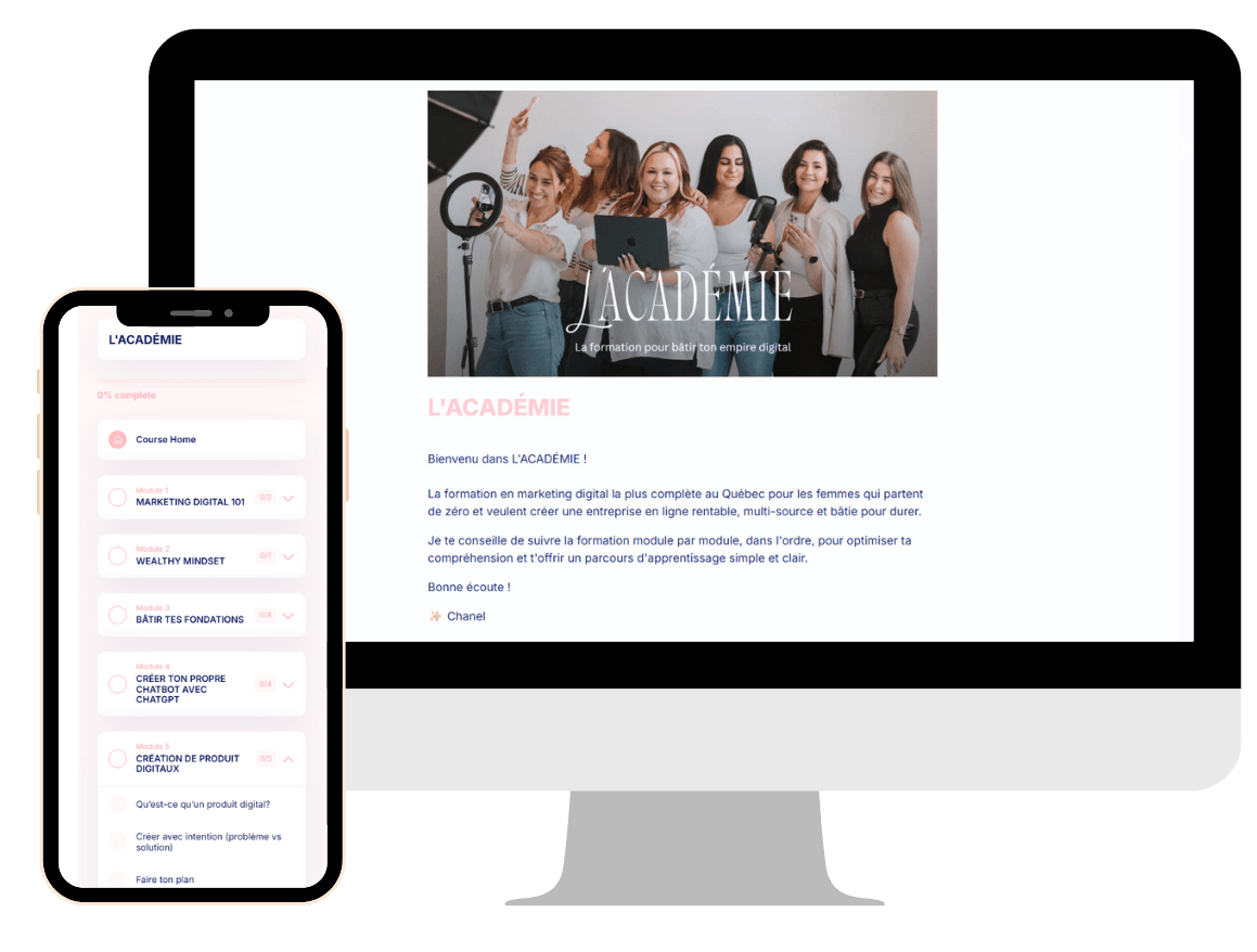 C'est d'ailleurs ce qui m'a menée à devenir co-créatrice de L’ACADÉMIE: une formation 100 % québécoise, créée en collaboration avec 12 autres entrepreneures à succès, pour apprendre à générer des revenus en ligne, grâce au marketing digital.